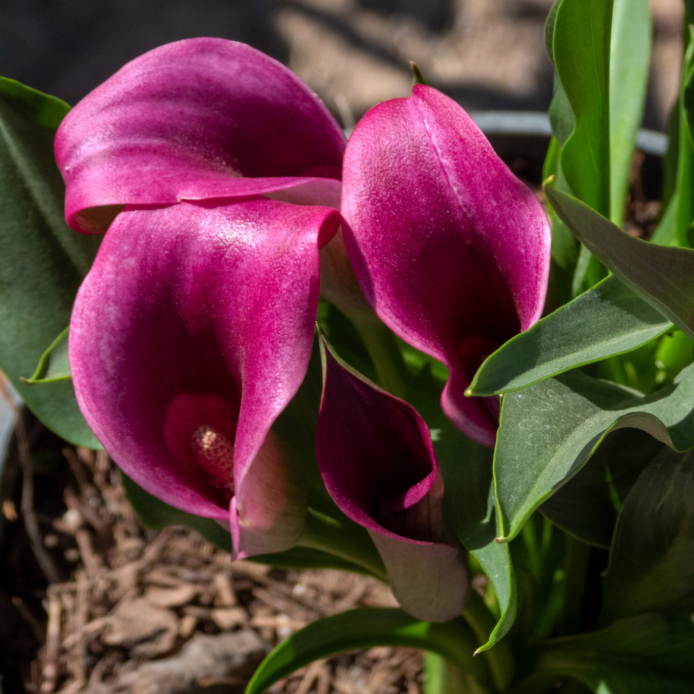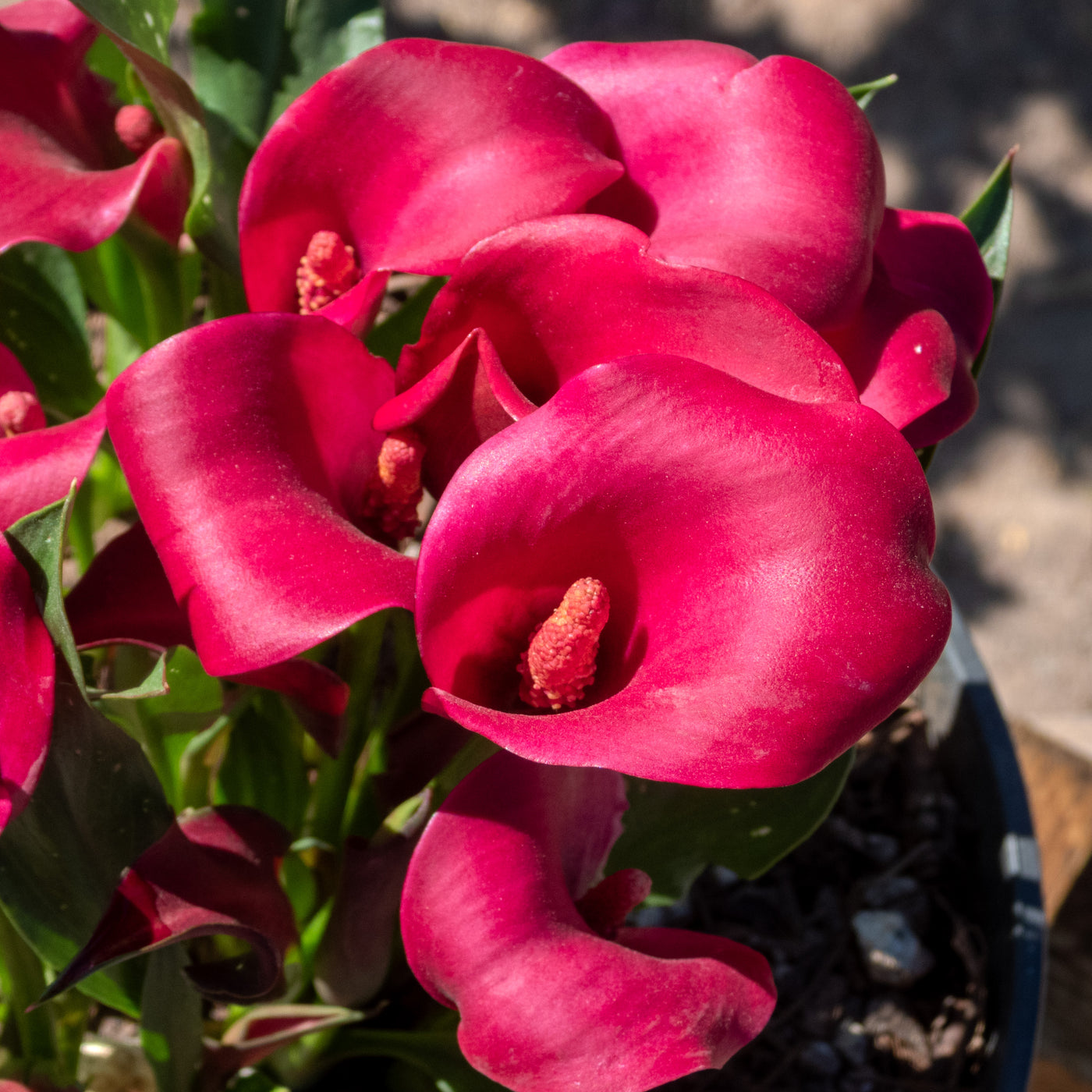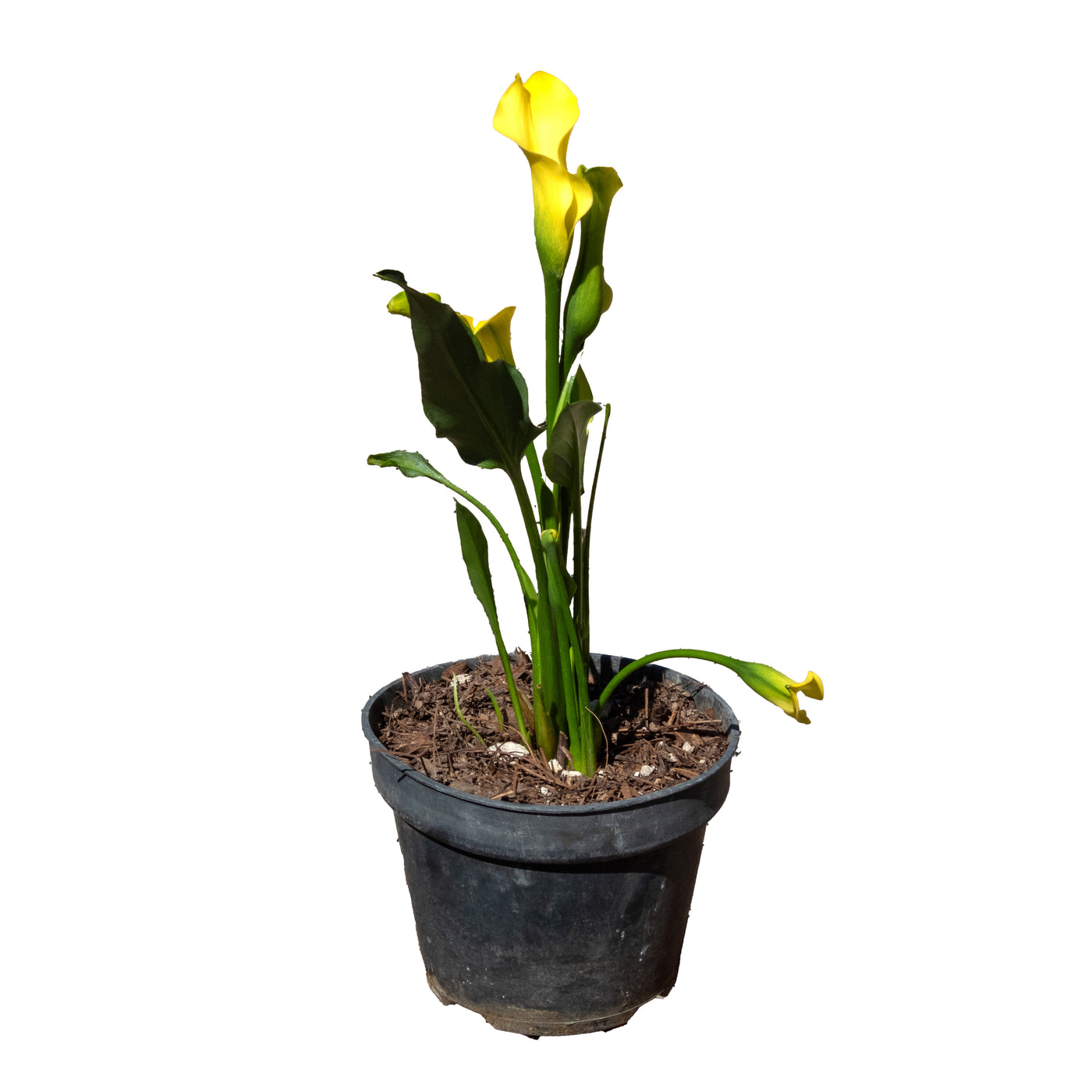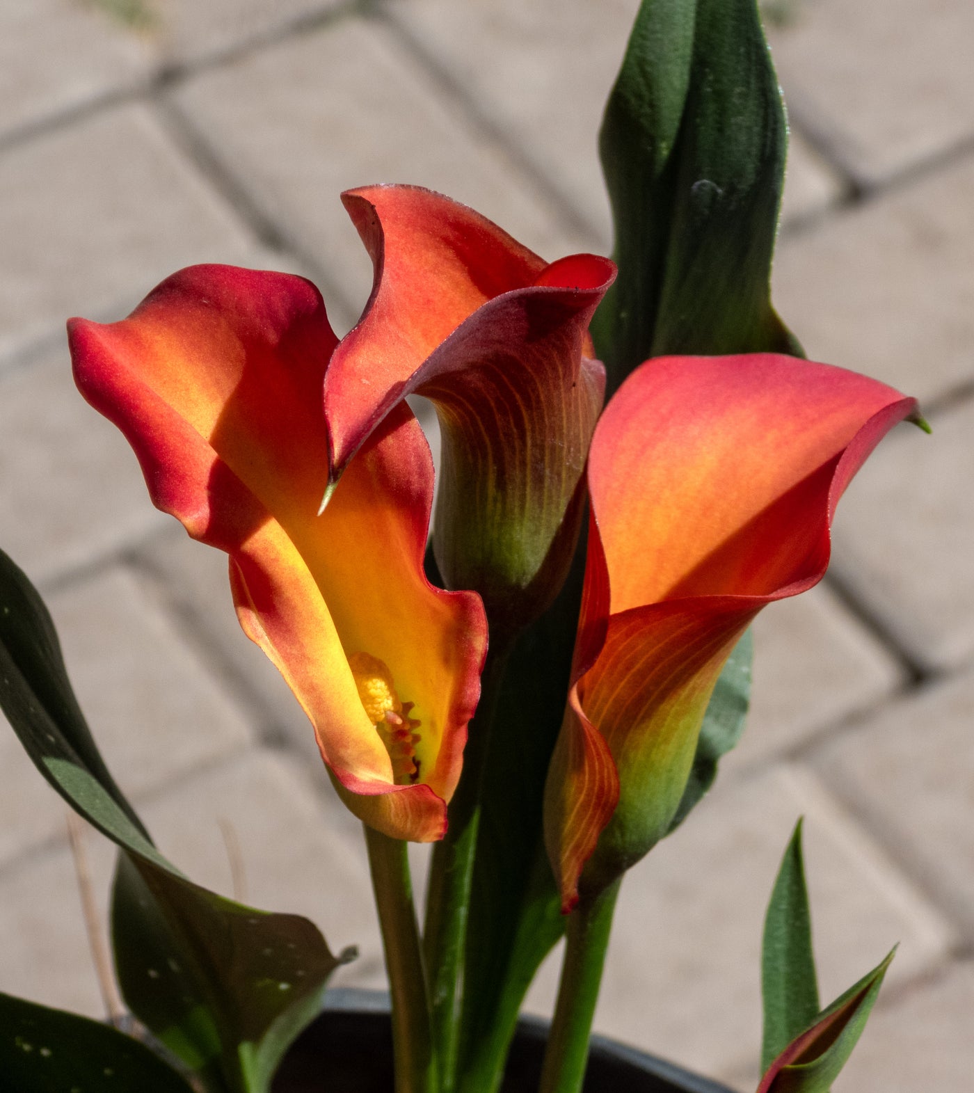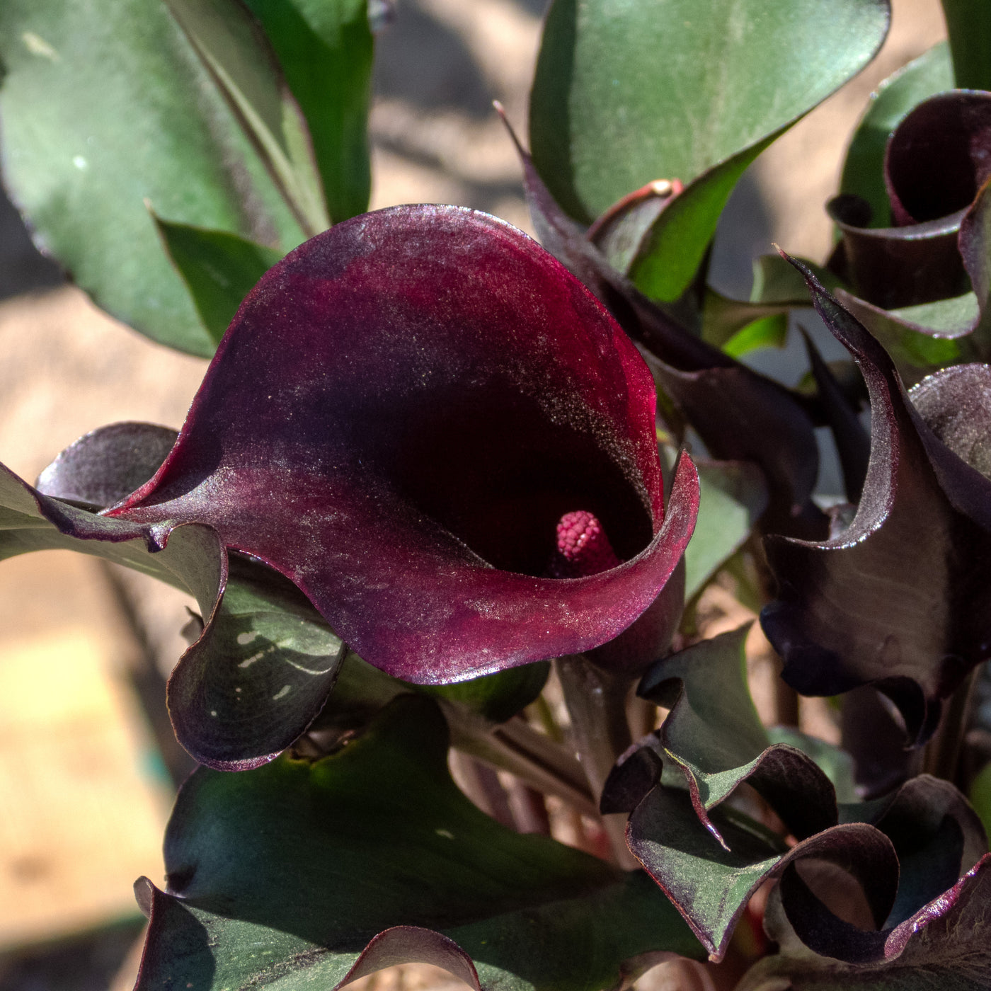 Variedad de alcatraz con flores en tonos vivos como rosa, morado, amarillo o naranja. Muy decorativa.