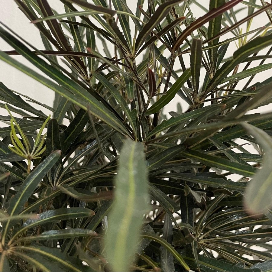 Planta tropical de follaje fino y brillante, ideal para interiores o patios sombreados.