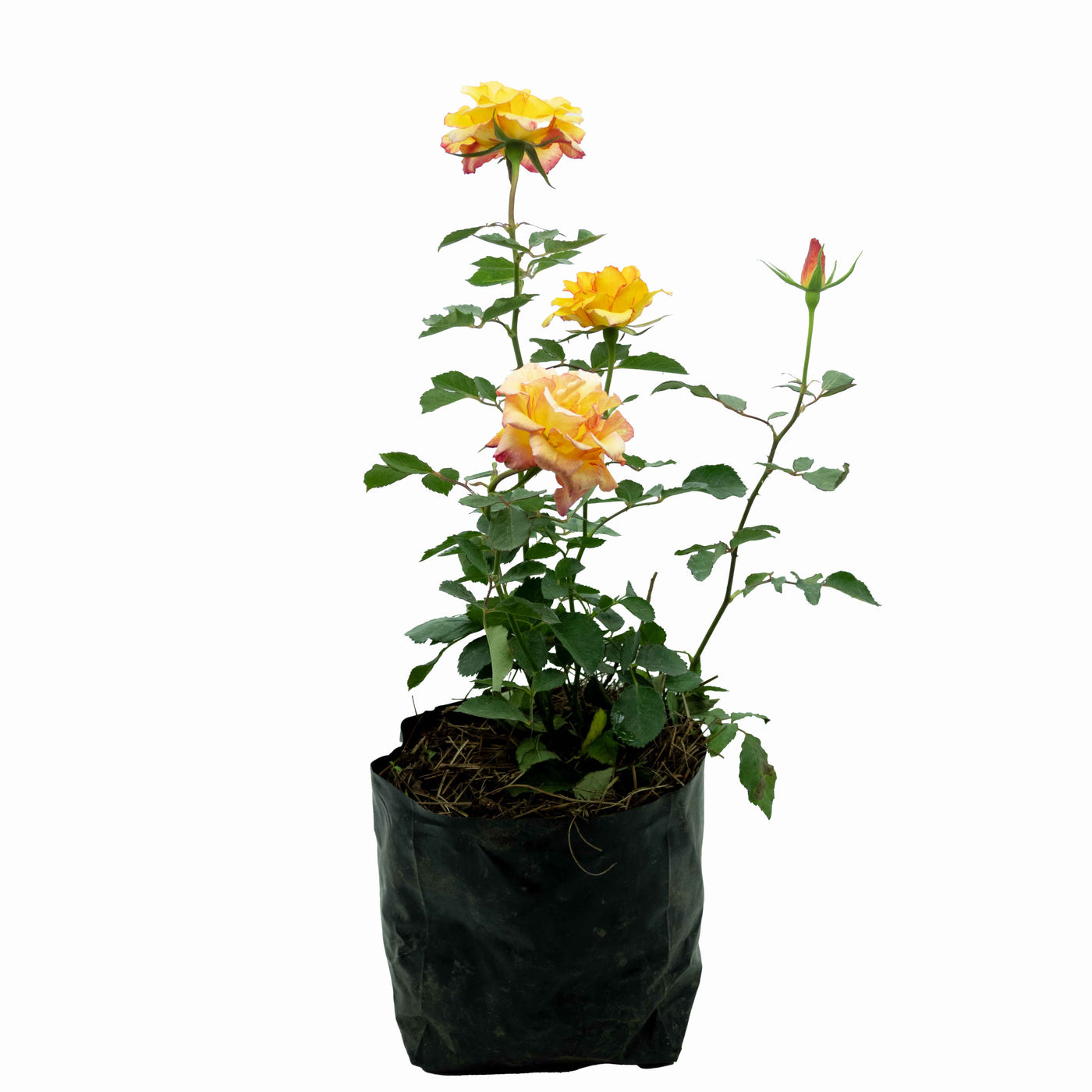 Rosa ornamental de crecimiento arbustivo, ideal para macetas o jardines soleados por su floración duradera.